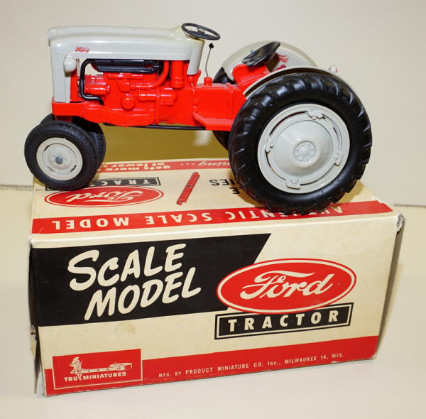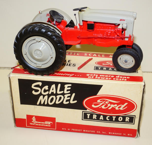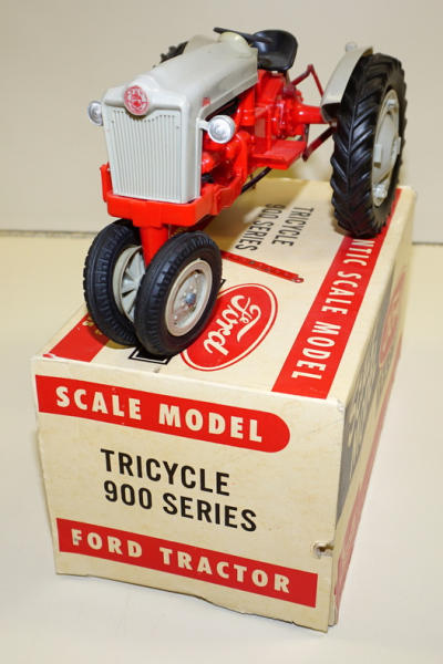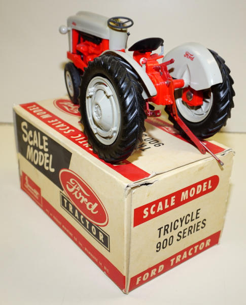 1/12th scale, 1950's plastic toy, metal 3pt hitch, one 3pt arm is loose, but looks to just need to be snapped back into place, I don't think damaged, includes a drawbar, overall near mint condition; box is complete, a few light tears on the ends, but overall nice, no box liner, box rates 8.5 condition; 900's in the box is very rare!