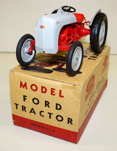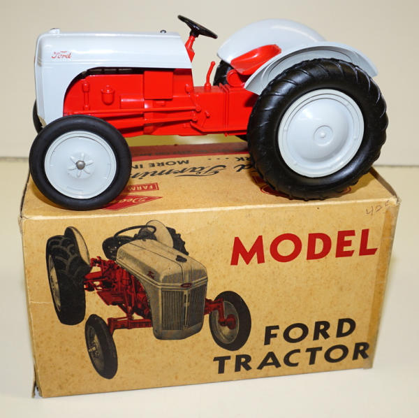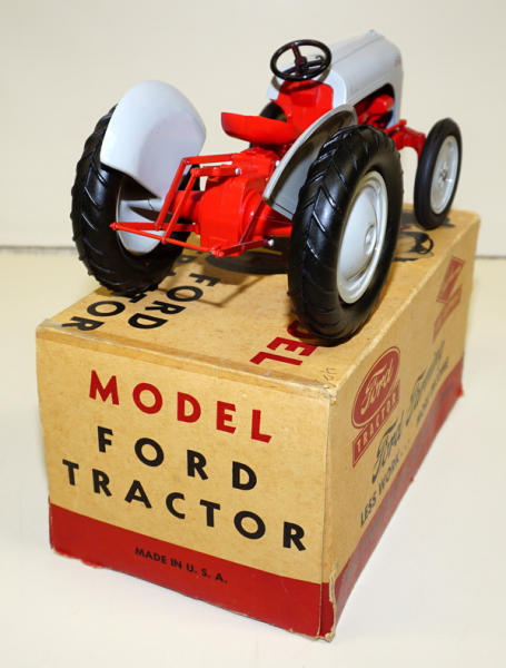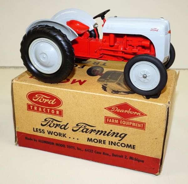 1/12th scale by Aluminum Products, but made of mostly plastic; 3pt hitch w/ drawbar, metal front end, non-windup version, mint toy; box has the liner; box has some old tape on the ends, age spots and general wear, but not bad, box rates 8 condition