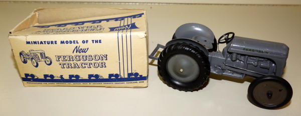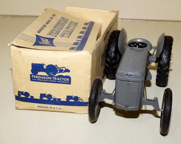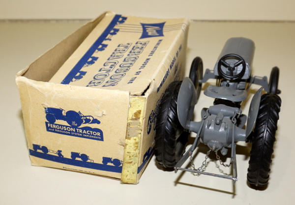 1/12th scale, Slush model toy, tin seat w/ 3pt & drawbar; box is complete, has some crushing and general wear, but a very hard box to find, box rates 8 condition