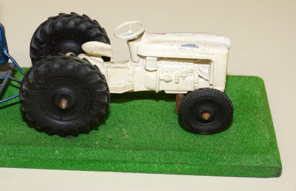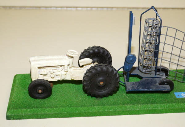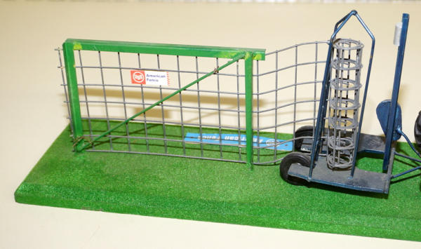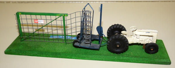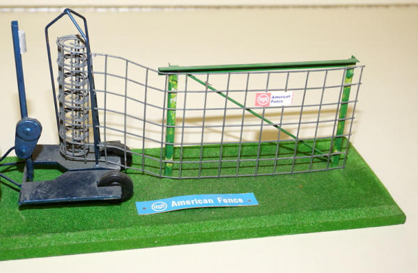 base is 16" long, Tootsie Toy Ford painted white, scratch built woven wire fence trailer with "American Fence" decals; probably used as a display at a farm & home show, never seen one before, neat piece, could use a detailed cleaning