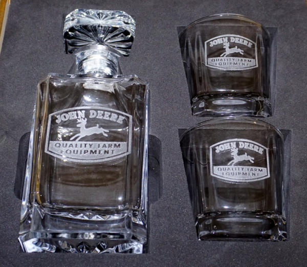 Custom etched decanter & 2 matching glasses in gift box, made by a local artist, box is 11"x11", very nice