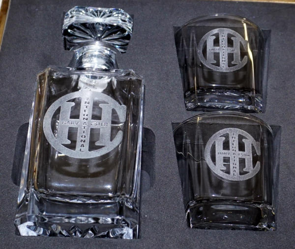 Custom etched decanter & 2 matching glasses in gift box, made by a local artist, box is 11"x11", very nice