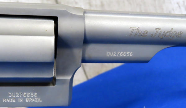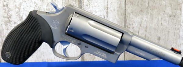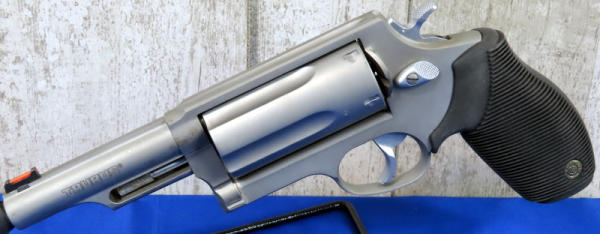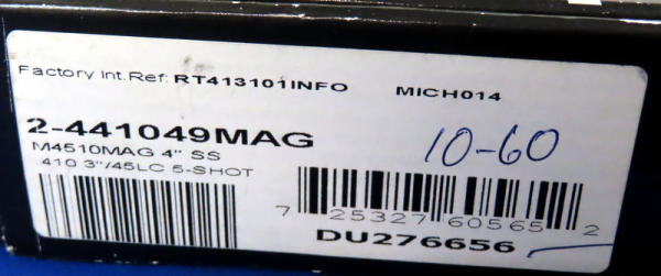 4" stainless barrel; hy-vis front sight; rubber grips; 5-shot swing out cylinder; slightly used, owner thought shot less than 10 times; nice & clean; original box; Brazil; SN#DU276656; A32