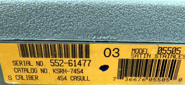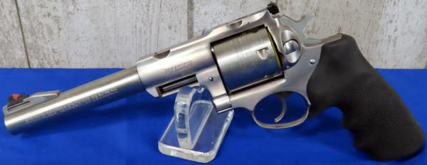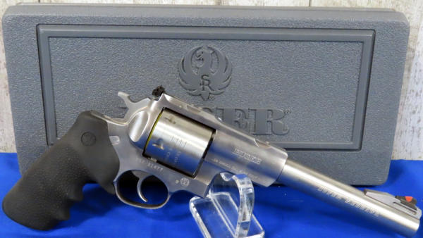 7.5" Stainless Barrel; looks like new; rubber grips; red ramp front sight w/rear white outline; 6-shot non-fluted swing out cylinder; factory hard case w/scope rings; these have been discontinued and very hard Ruger revolver to find! USA; SN#552-61477; A12