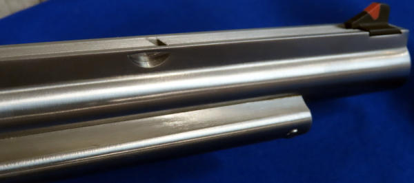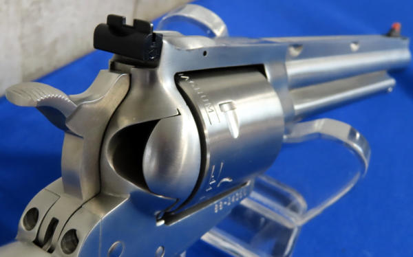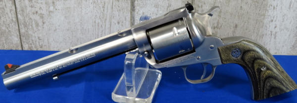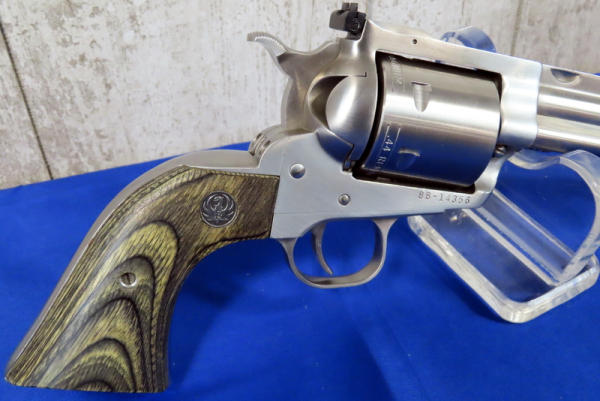"GFE"; 7.5" Stainless barrel; wood grain laminate grips; red ramp front sight; factory hard case; 6-shot non-fluted fixed cylinder; USA; SN#88-14356; A30