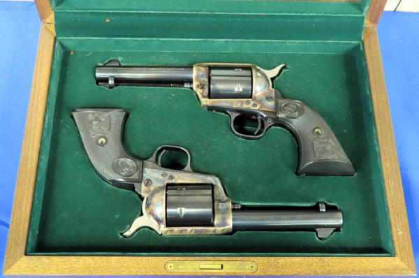 WOW, one of the highlights when it comes to the handguns! This firearms are identical and mint/unfired; 4.75" BBLs; case hardened receiver; checkered factory plastic grips; 6-shot fixed cylinders; comes in a glass face display case; these are consecutive SN#'s - SA56246 & SA56247; sell for one money; A29