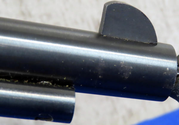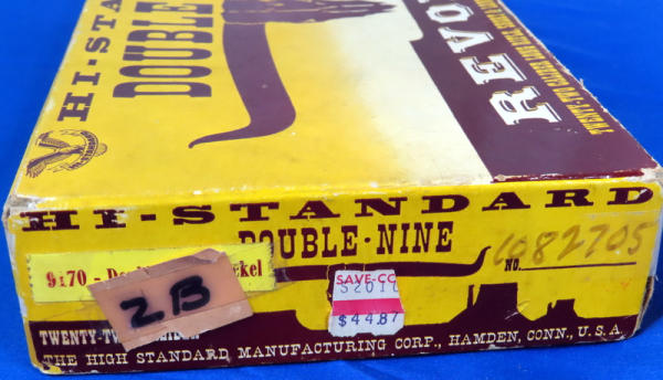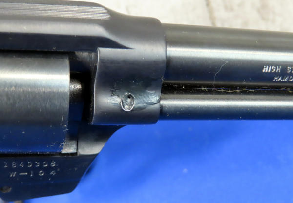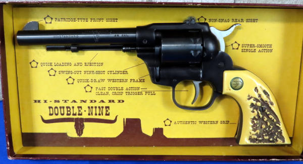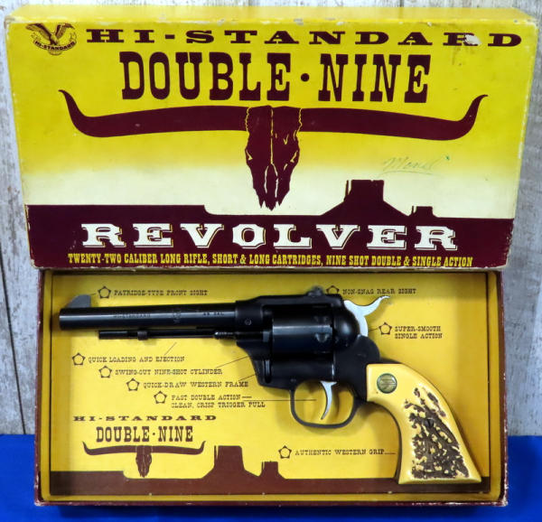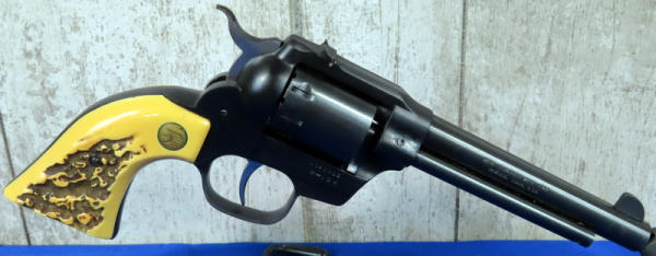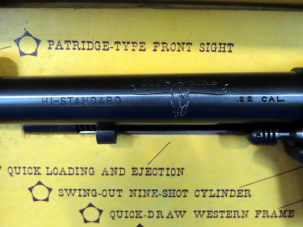 5.5" BBL; near mint & unfired; 9-shot swing out cylinder; nice graphic box; plastic stag style grips; has a spot behind barrel on right side that looks like it's been touched up & a couple very minor spotting issues towards muzzle; USA: SN#1840308; A60