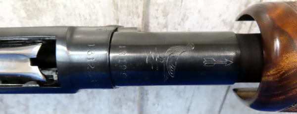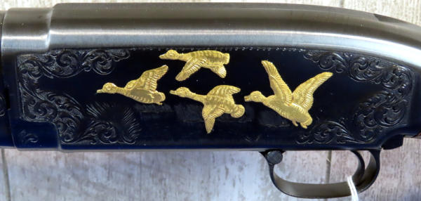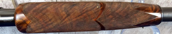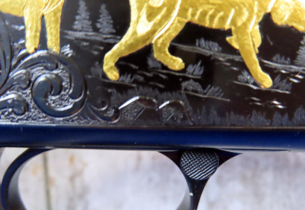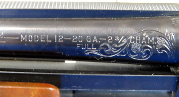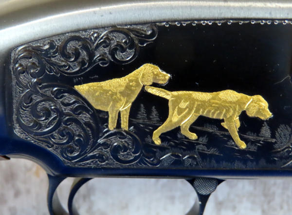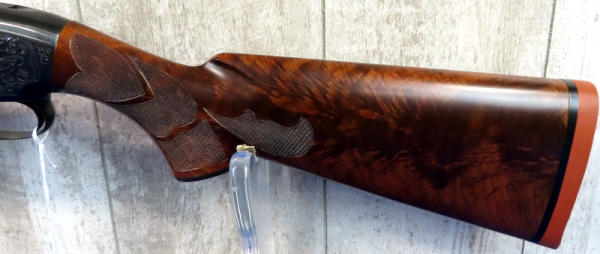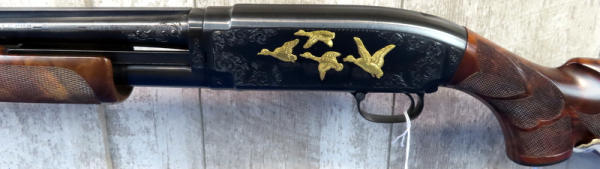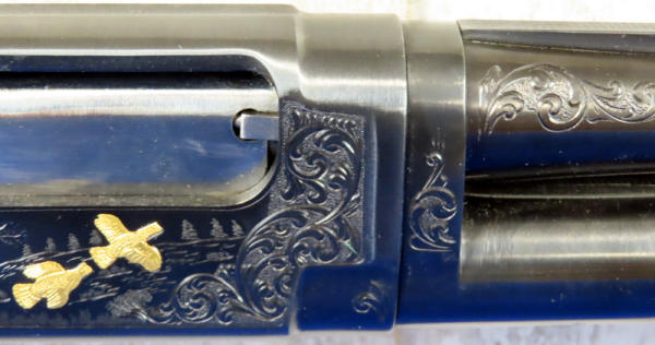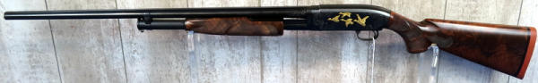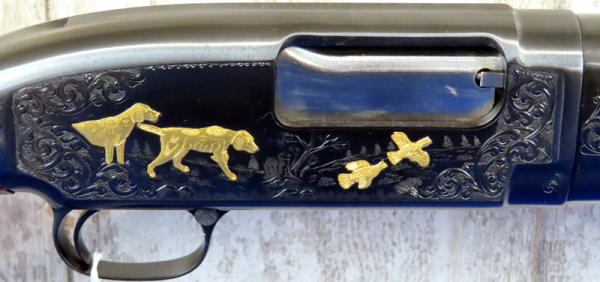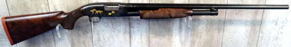 Larry Curry was once a premier engraver for Winchester and he custom engraved this firearm after his work with Winchester; 28" Solid-Rib BBL; beautiful American Black Walnut checkered stock; gold inlay of Dogs/Quails & Ducks; 2.75" & FC; does have LC signature in the rock below the front dog; USA; SN#1312966; A45