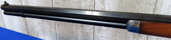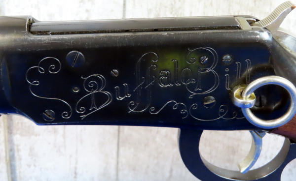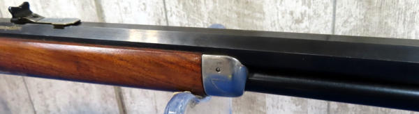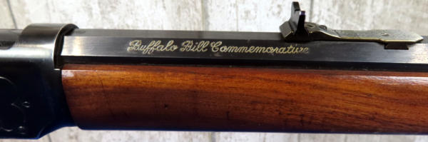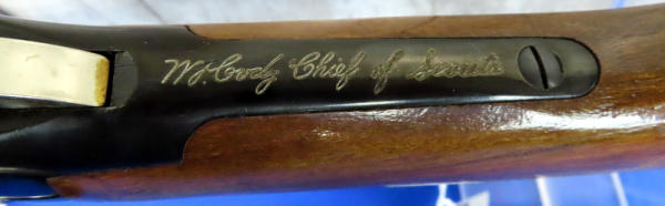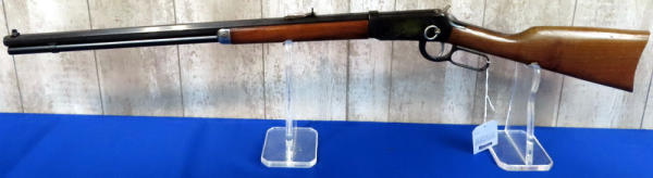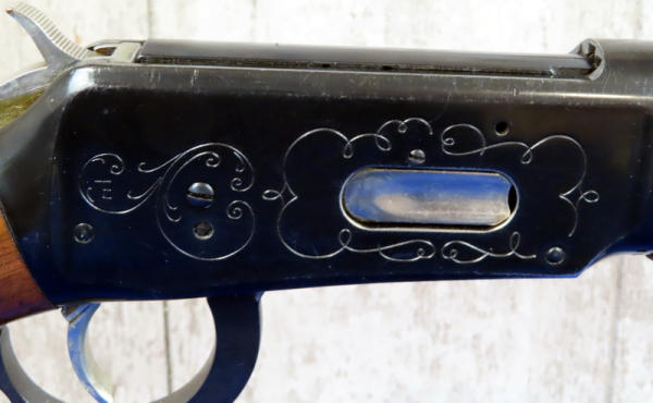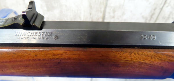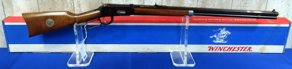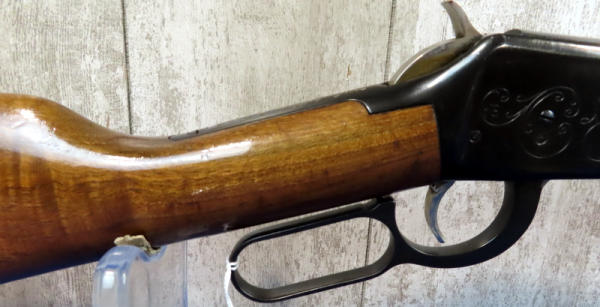 26" Oct. BBL; gun I don't believe has been fired, but does have some marks from handle and storage wear; comes in a Red/White/Blue Winchester box, but not correct to gun; stainless hammer, trigger & forearm cap; medallion in stock; saddle ring; scroll engraving on receiver; USA; SN#WC117664; A8