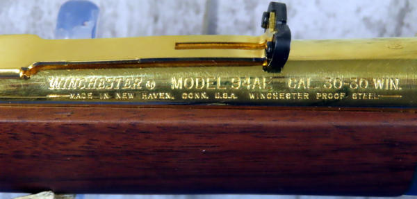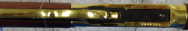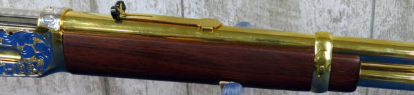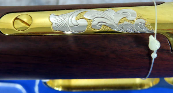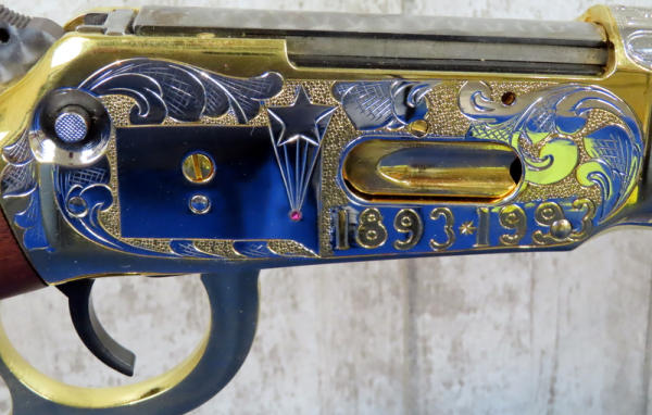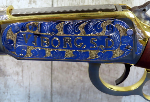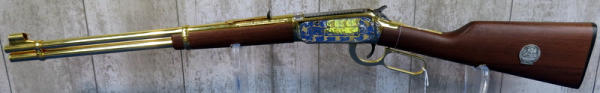 Somehow, the seller found this firearm all the way out on an auction in California and brought it back home!! 20" Rnd. Gold plated Barrel; gold barrel, receiver, lever, bands, sights; highly engraved on both side w/jewel in spot of Viborg on the state outline; 1993; only 1 of 10 made!!! Original box; medallion on stock; mint & unfired; USA: SN#6054042; A48