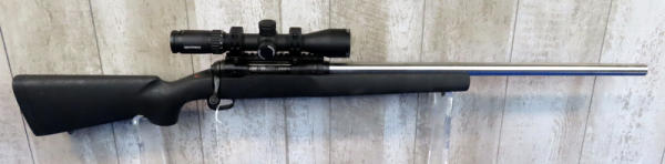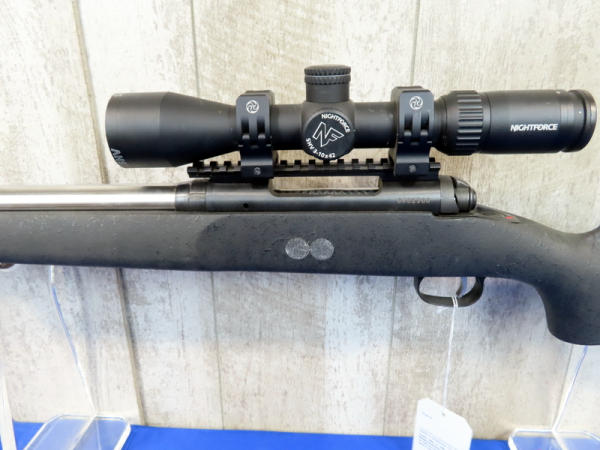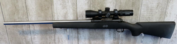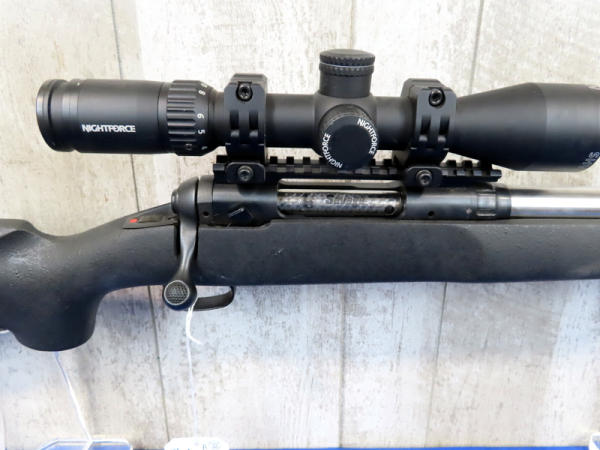 "GFE"; caliber unknown, measures around 7.65mm; 24" stainless barrel; black synthetic stock has some overspray on butt; smooth action; Nightforce SHV 3-10x42 scope; box; USA; SN#G482566; A30