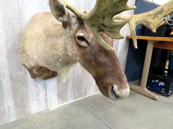 "GFE"; small than the previous animal, but this has a double paddle; about 37" from bottom of neck to top of antlers; from tip to tip is 22" and sticks out from the wall 36"; nice mount; Local Pickup Only, NO SHIPPING
