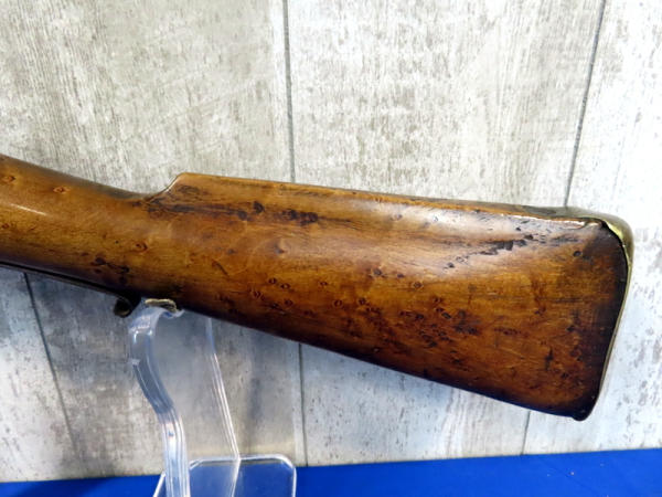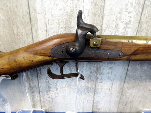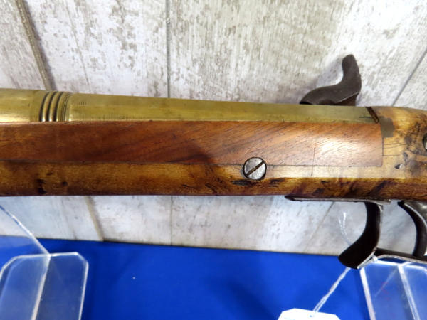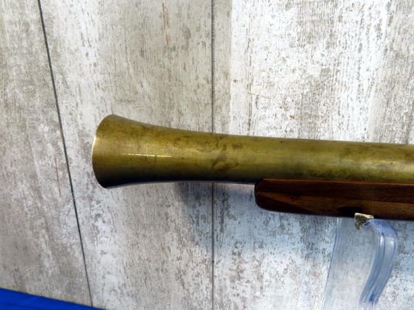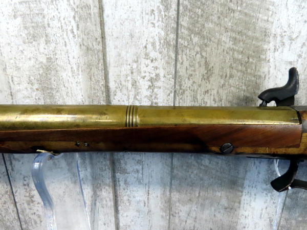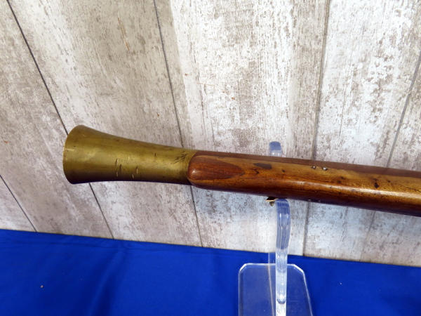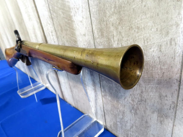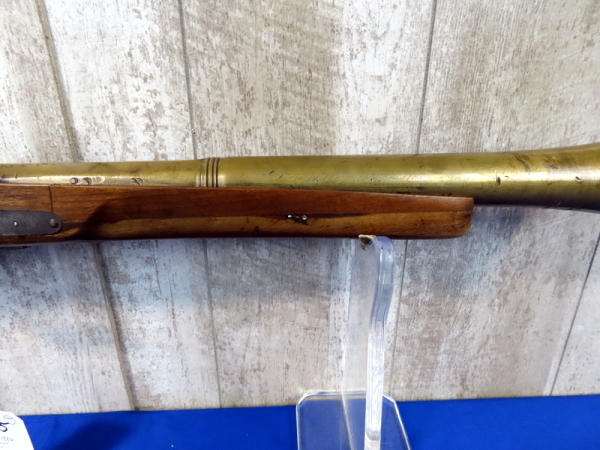 18" Brass Barrel w/Bell muzzle; right side plate is marked "Barnett - London - 1886"; Hammer Mechanism & trigger work; brass butt plate; wood has a few cracks and parts that have been fixed over time; barrel has some dings from use; muzzle is 2.25" in diameter! very early and unique antique firearm! No Transfer needed