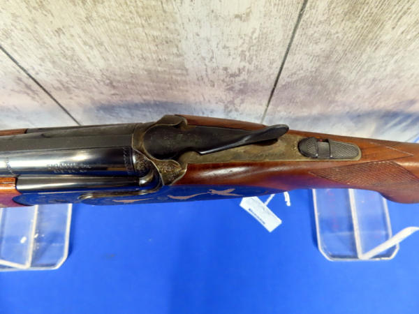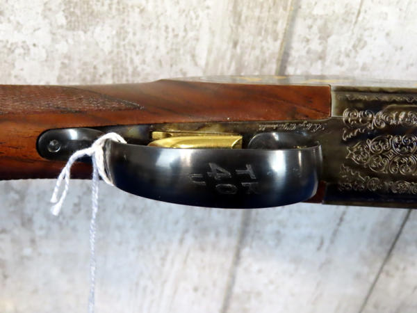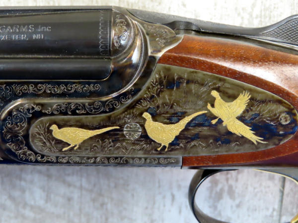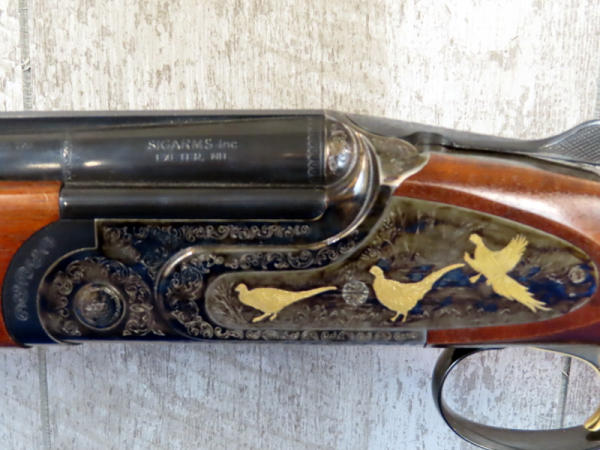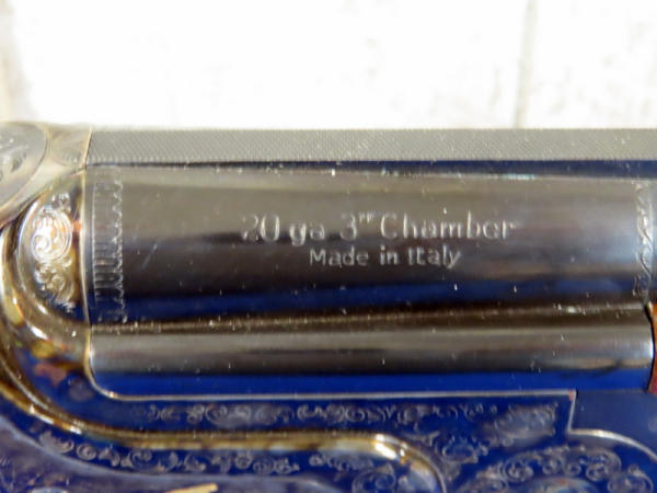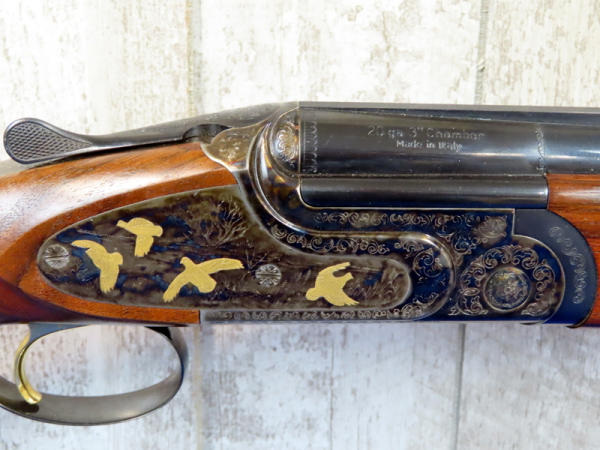 "GFE"; 26.5" VR-BBL; easy break action; highly engraved case hardened receiver w/gold inlay of Pheasant & Quail; single gold trigger; checkered wood stock; looks mint & unfired; comes in an aluminum hard case; removable chokes; 3"; Italy; Beautiful Gun!; SN#EX03764; A30
