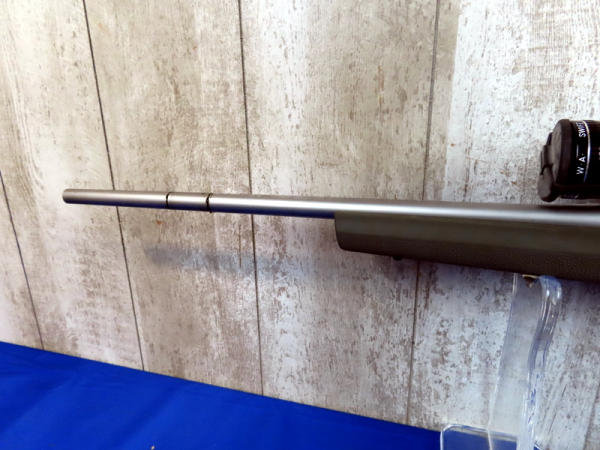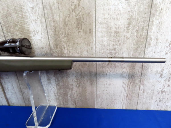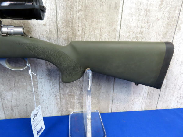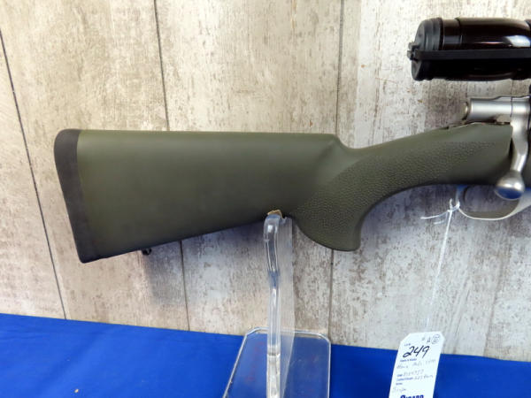 "GFE"; 22" Stainless barrel; has some tar or glue near the muzzle; Hogue green rubberized stock; smooth action; Swift 4-12x40 scope; Japan; SN#B084737; A30