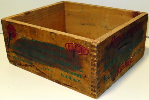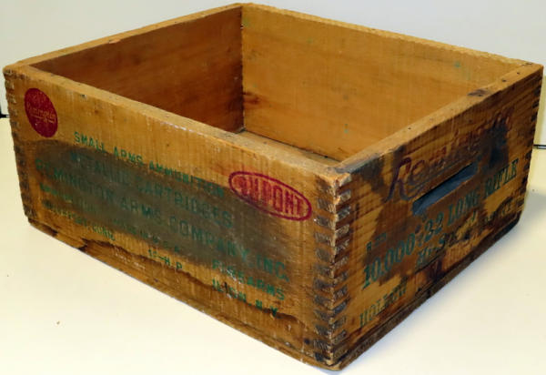 dovetail corners; extremely nice lettering and color; has a some stains on each side; 14.5"x12"x6";