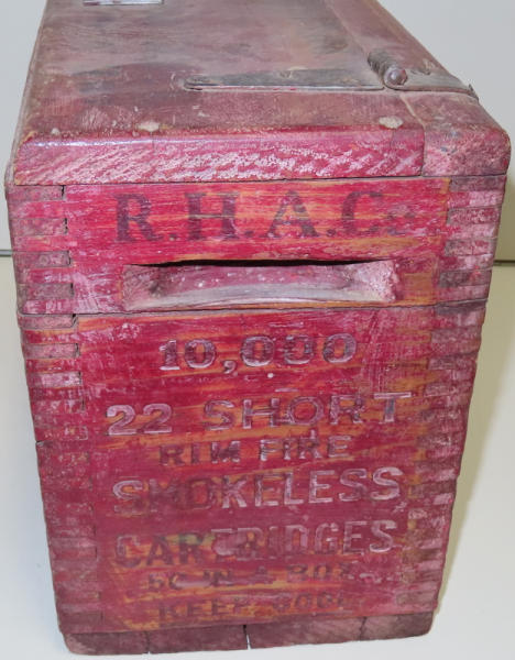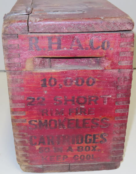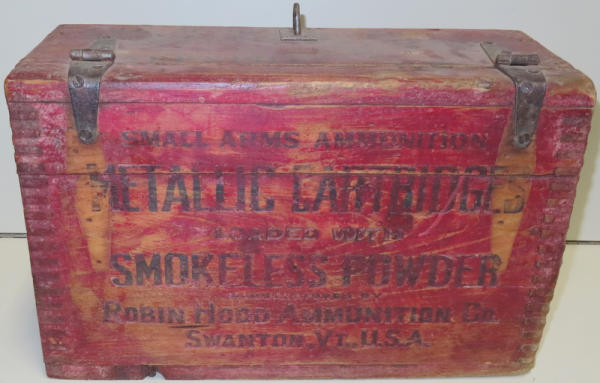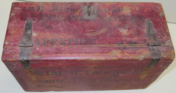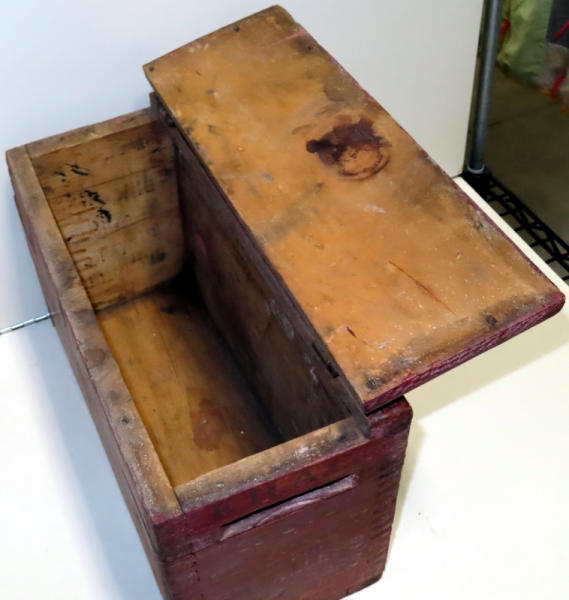 another very hard to find crate; has been painted long ago but you can still see the lettering; metal hinged lid; missing front latch; dovetail corners; 15.5"x10"x7"