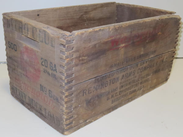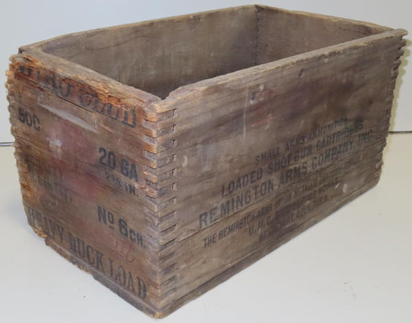lettering is worn but still visible; dovetail corners; good bottom; one end has some damage; 15"x8.5"x8";