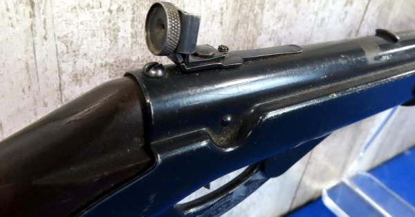 unique w/factory peep sights; wood stock; works but extremely weak compression; has some use marks