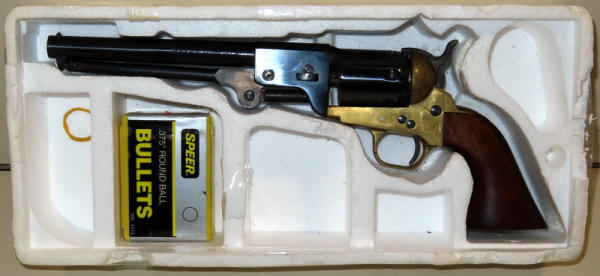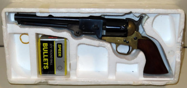 7.5" BBL; brass frame and handle straps; believe has been fired; has styrofoam but no box; includes a partial box of Speer .375" Round Ball Bullets; NO TRANSFER NEEDED
