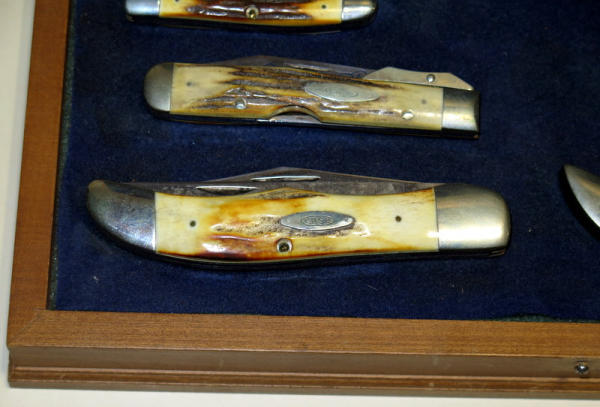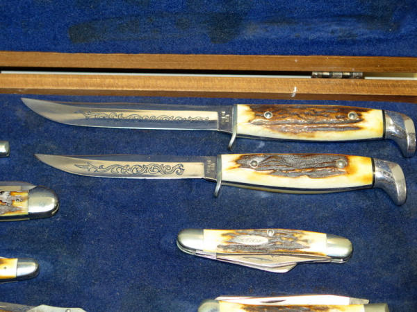 8 folding knives and two fixed blade; all have wonderful looking stag/antler handles w/blue scroll engraving on the blades; largest folding knife is 5.5" folded and smallest is 2.75"; longest fixed blade is 9.5"; wooden box is 14"x10"x3" and does have some scratches on it; believe to be from a 1977 set from what I have researched; buy as a set;