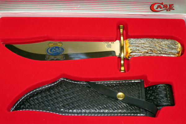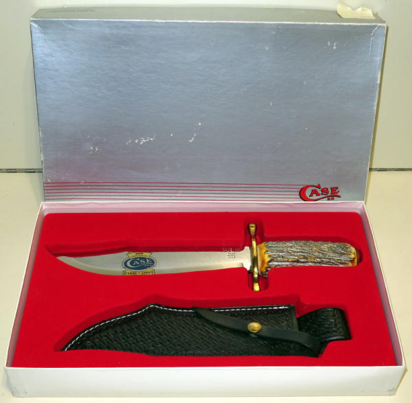 9" Blade & 14.5" overall; stag handle; beautiful 100th anniversary logo etched on blade; leather sheath; factory box; Mint & very heavy!