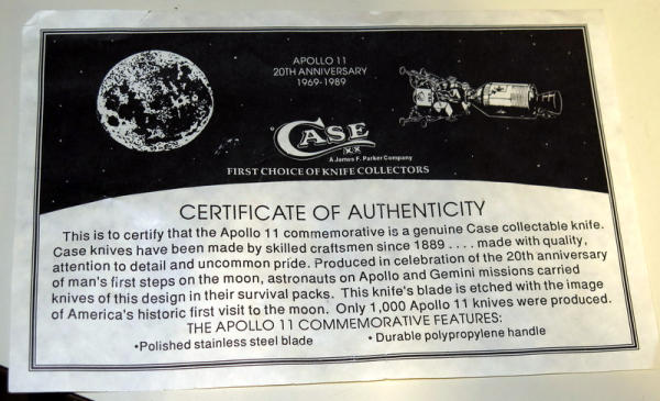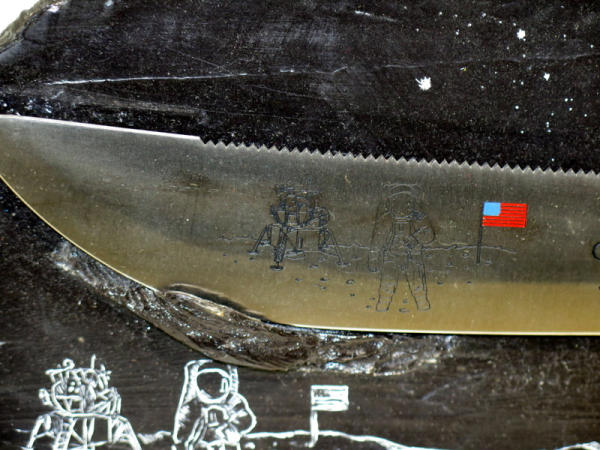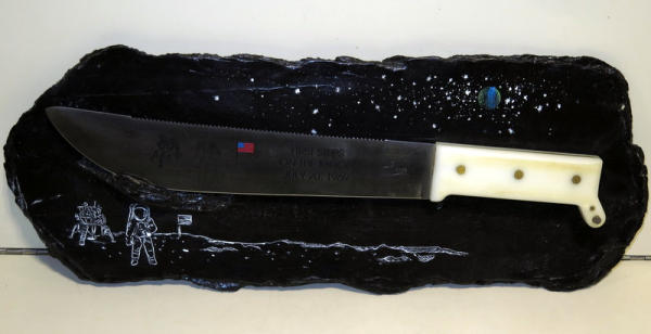 11.25" Blade & 17" overall; SN#598 of only 1,000 mfg.; has moon landing graphics and date on blade; moon-like rock base to hang on! Original box & COA; very cool piece!