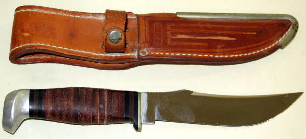 no model number; leather sheath has some minor wear; 4.75" Blade & 9" overall; nice