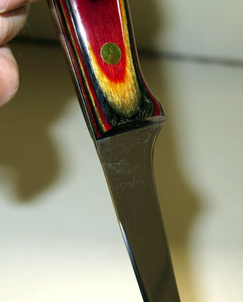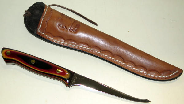 near mint w/leather sheath; all custom made w/double edge blade; super sharp & beautiful; 9.5" long overall