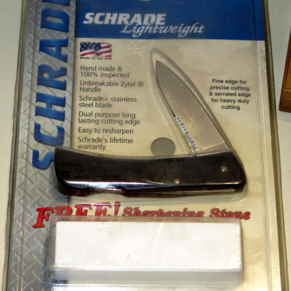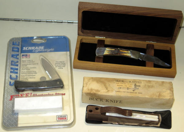 Schrade is NIP, single blade & 4" long folded; Case is single blade, #600 in a wooden case w/stag handle; BUCK is Mini-Sharp Mdl.140 w/original box; all nice shape; sell for one money