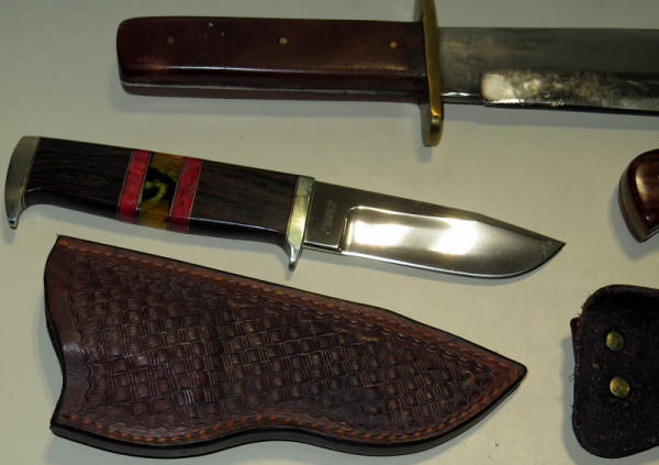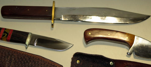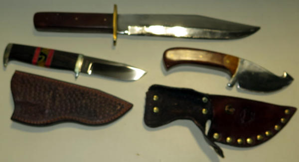could possibly be custom made; skinner has wood handle & 8.5" overall w/leather sheath; multi-color handle believe is custom w/ "WOLF" stamped on blade, 9" overall w/leather sheath; large bowie believe is custom, not perfect, 15.25" overall; sell for one money