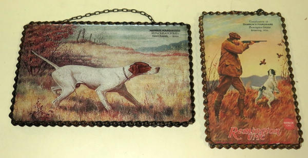 Guy with the gun is a Remington one; both glass w/chain borders; reproductions; big one is 7"x4.5"; sell 2x the money
