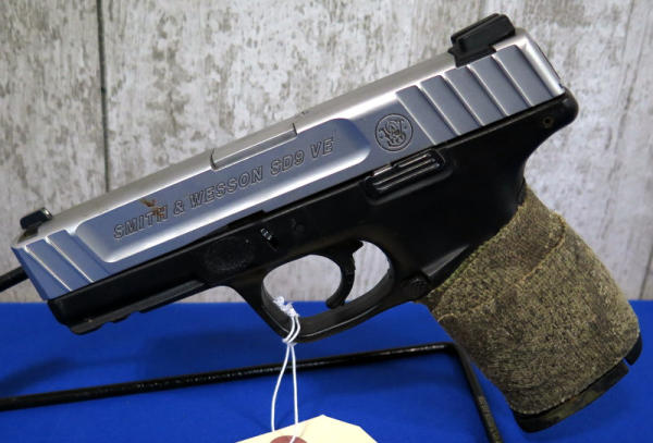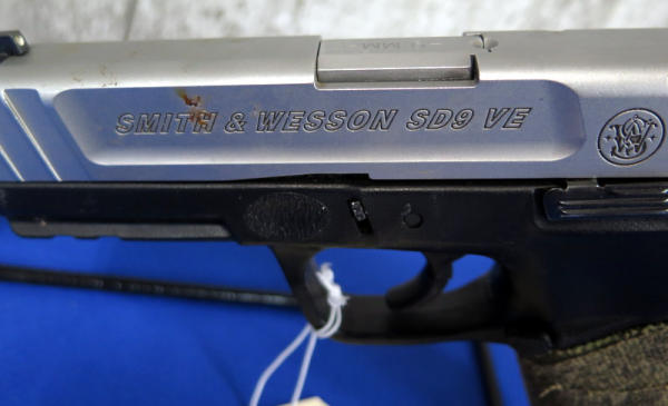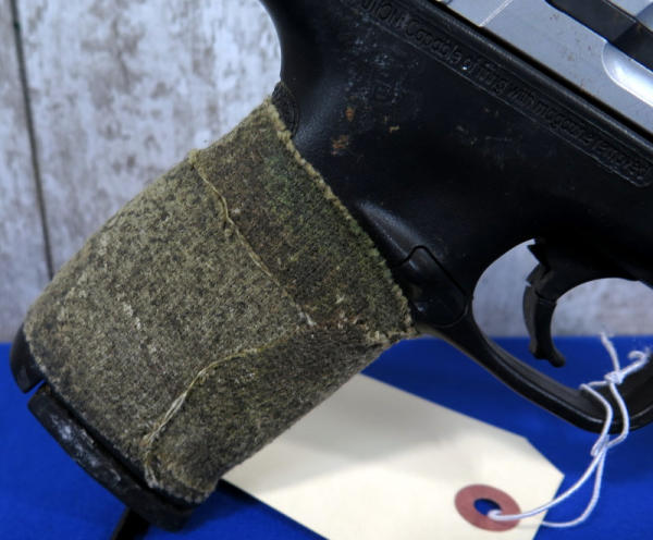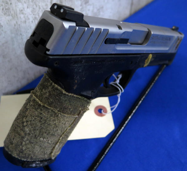 4" stainless Barrel; stainless slide w/composite frame; one magazine; has some rusting; needs a cleaning; tape around the handle; night sights; USA; SN#FBJ0704