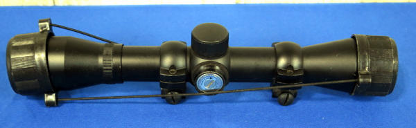 has caps; clear; scope mounts; missing one cap on adjustment dial; 10.25" long