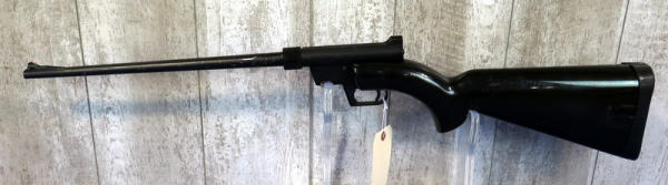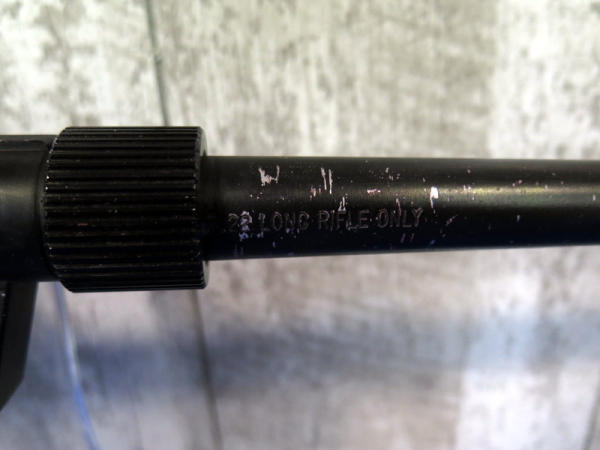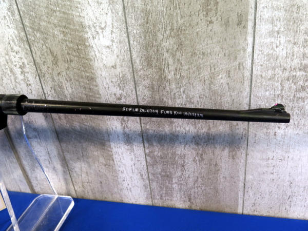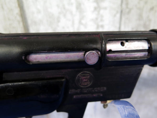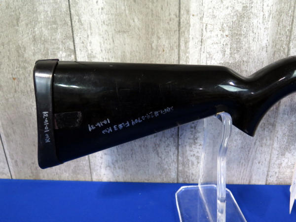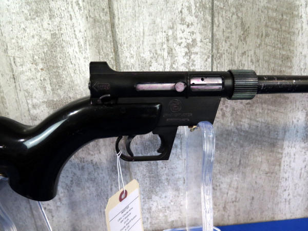 16" BBL; comes apart and everything fits inside the plastic stock; no magazine; has some scratches & wear; has a red/pink substance on it, maybe from being finger printed; Markings from a grey marker on stock, butt plate & barrel; USA: SN#A55733