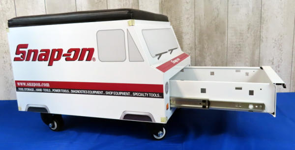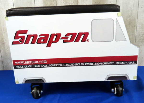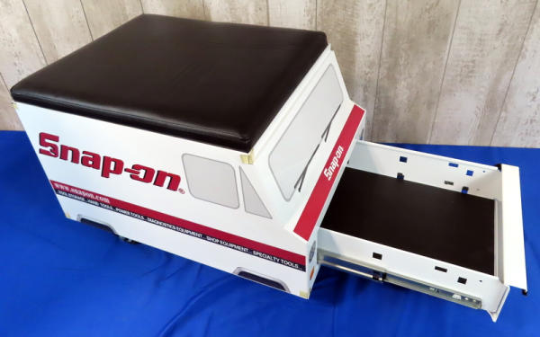 super clean; has a drawer in back & front; nice padded seat; rolls great; 24"x17"x17"