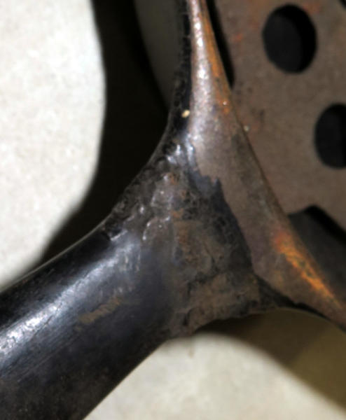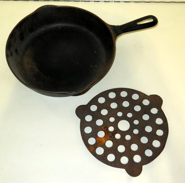 handle on skillet has been repaired, check pics; Both need cleaning; both have surface rust: skillet 9'' diameter: meat rack 7" diameter; sell as a family