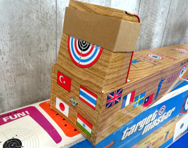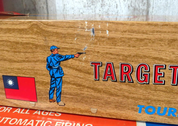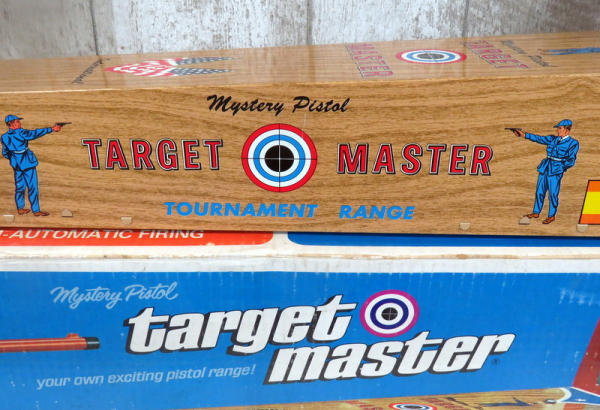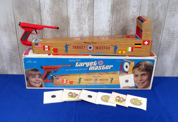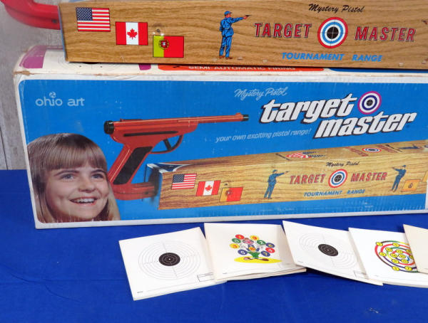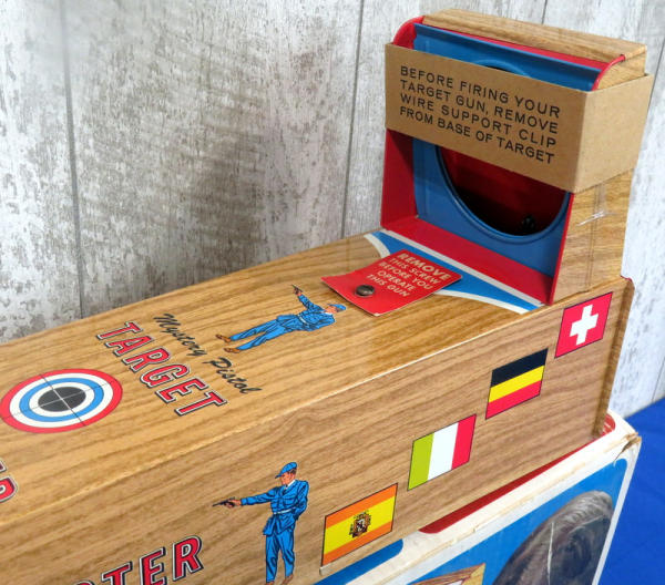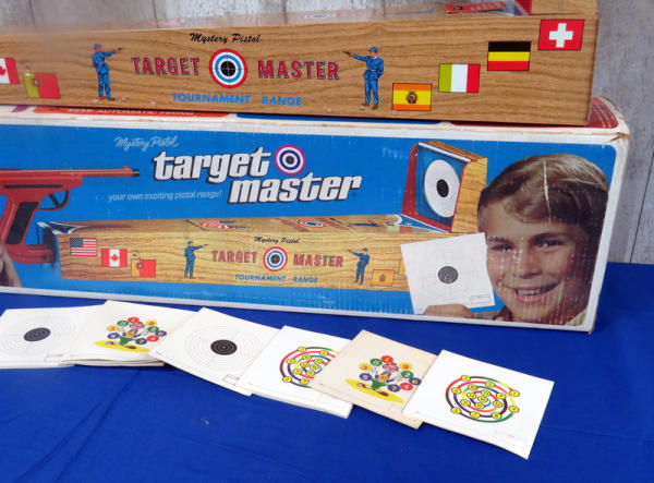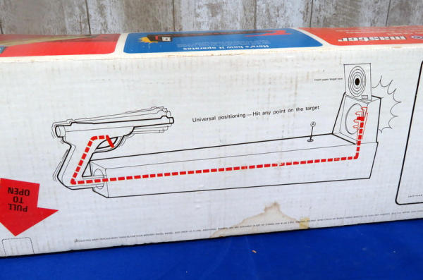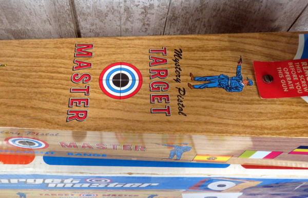 toy is like new, made of tin w/amazing graphics! Has some minor rub wear on one side but otherwise near perfect; includes original paper targets and box; box is 32" long; neat toy!