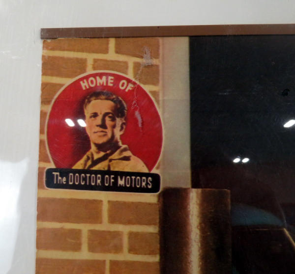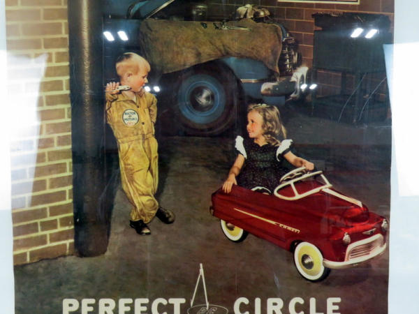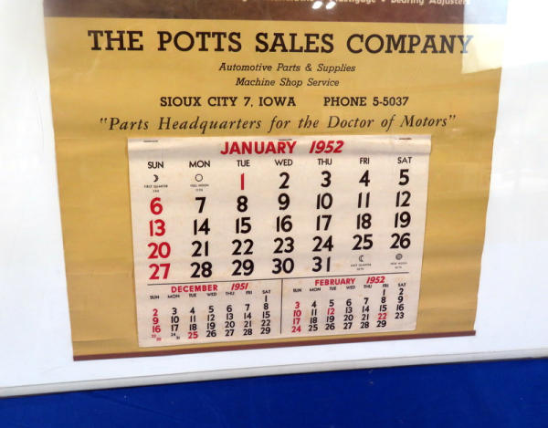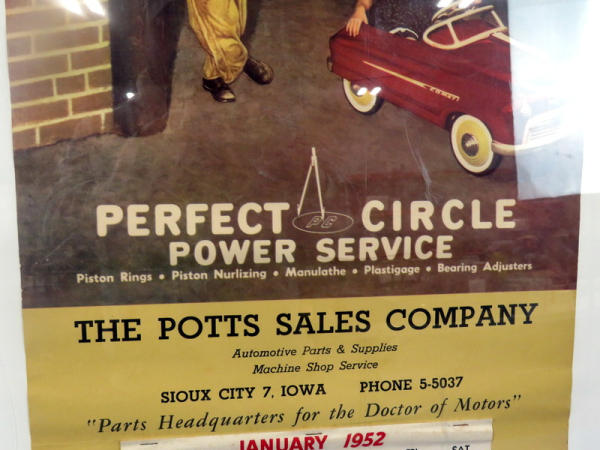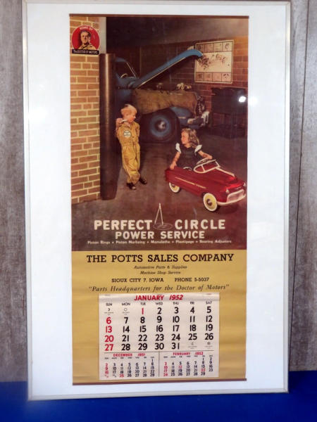 has a little girl sitting in a Comet pedal car w/little boy in service station outfit; has full calendar pad; metal bands on top and bottom; in frame; poster is 33"x16"; if needing shipped, be much cheaper to remove calendar and roll it rather than ship in frame