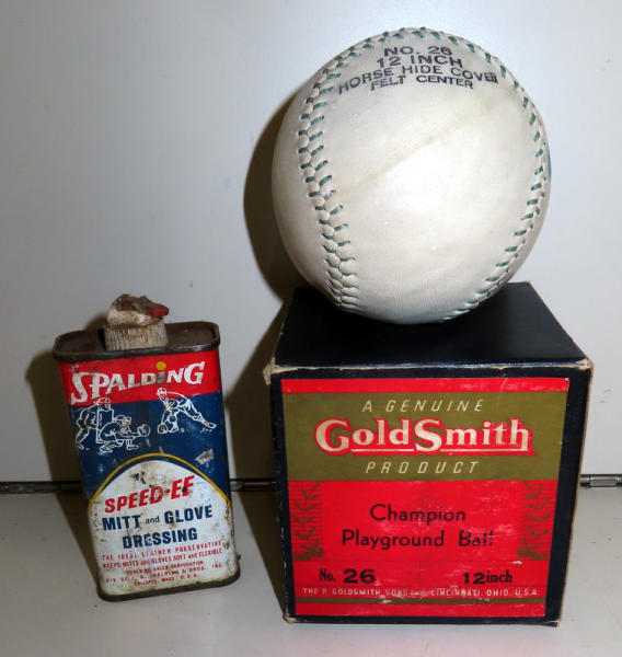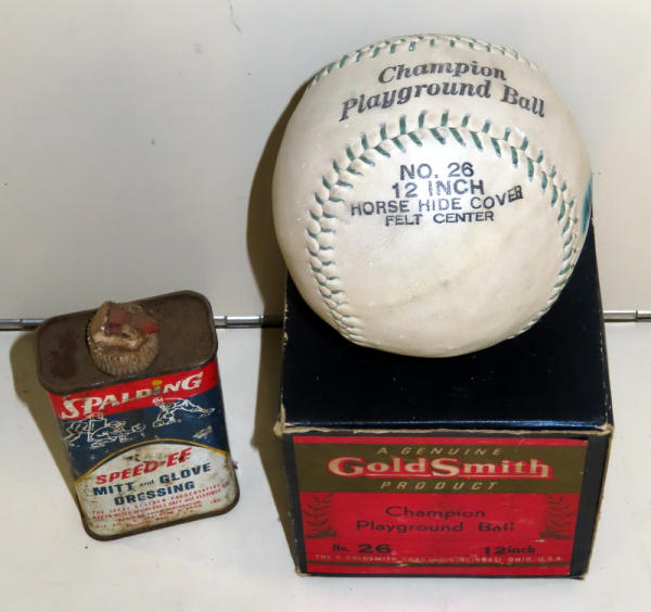 softball is NOS and 12" horse hide w/original box; all mint but the softball has May 14th 1936 written on it; Spalding "Speed-EE" oil can shows wear; sell for one money