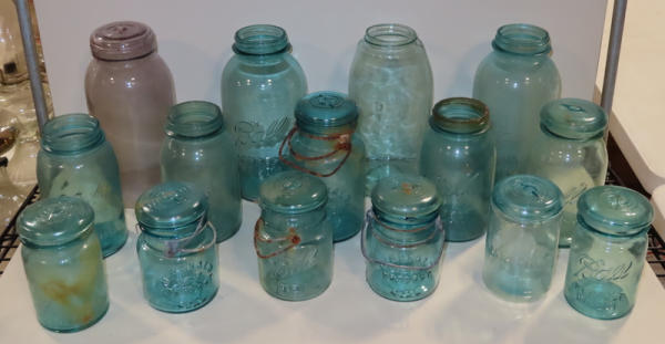 some are ball; several have glass lids; purple jar is 10" tall; sell for one money; NO SHIPPING, local pickup only