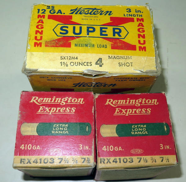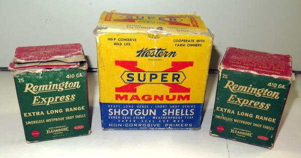 all boxes have some minor wear and missing a couple flaps; 2 boxes look full w/correct ammo, one .410 box only has about 10-rounds of mixed shells; sell for one money