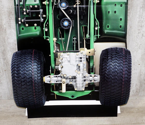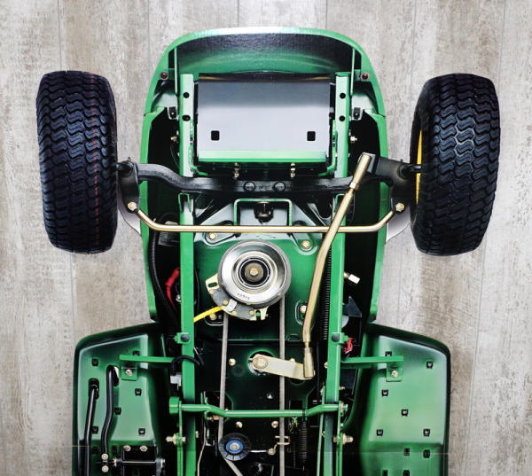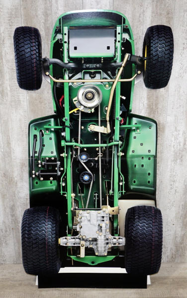 stands over 6' tall, pretty new, shows the undercarriage of a JD mower