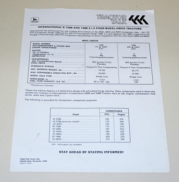 unique single sheet issued by JD that IH was introducing the 7288 & 7488 to compete with the 4850 & 8450 Tractors, small stain, but overall very nice & unique piece of sales literature