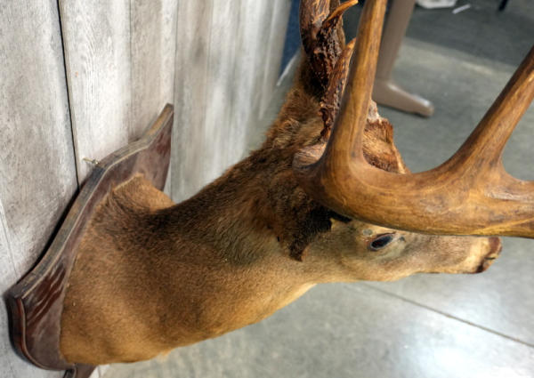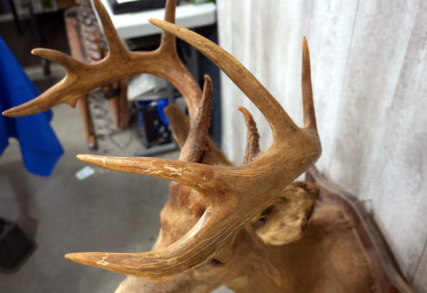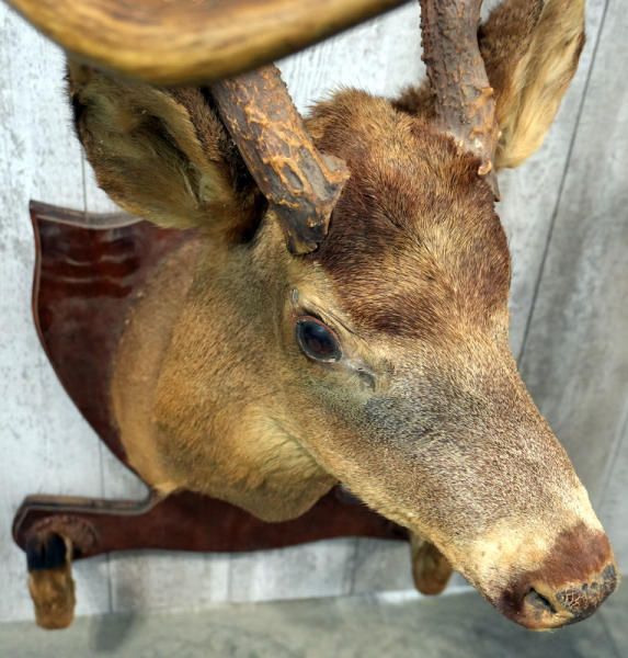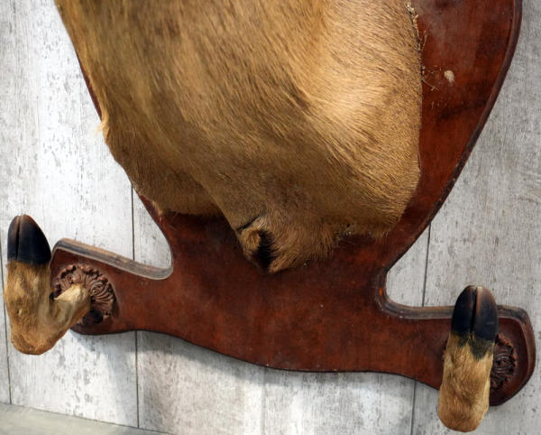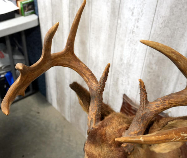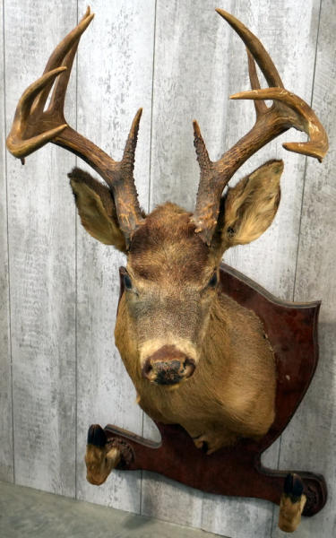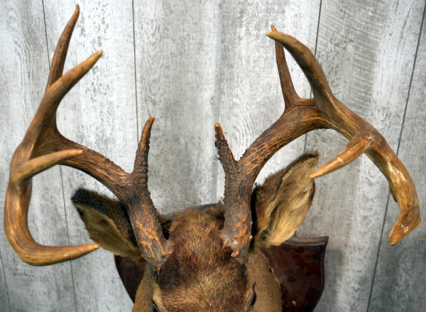 large thick rack; old taxidermy; mounted to wood base; 17" spread; needs a cleaning; NO SHIPPING, due to size