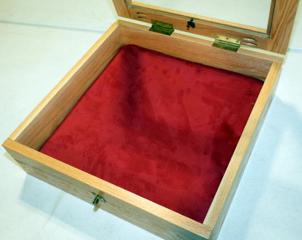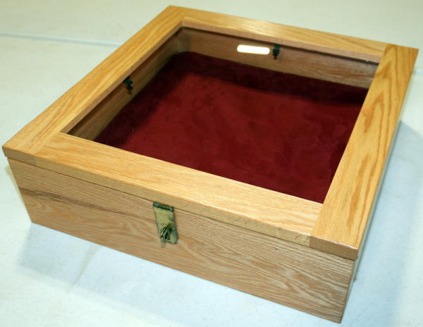 very nice; glass face; wood body w/padded inside; lays on top of a table; 18"x18"x5.5"; prefer local pickup due to glass