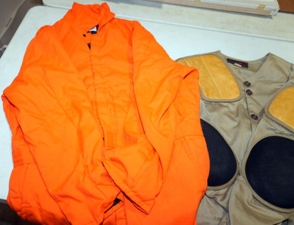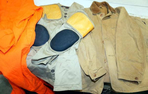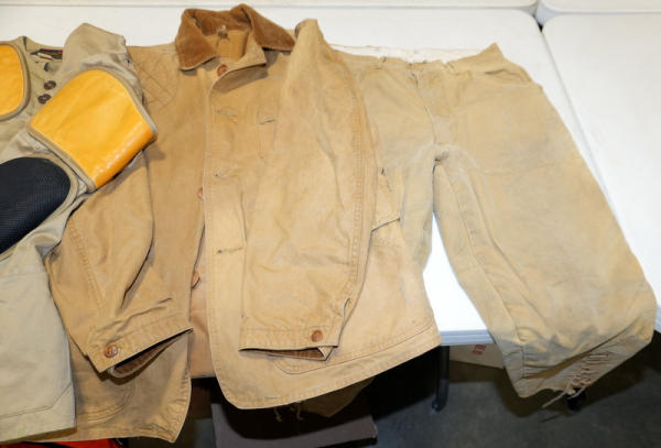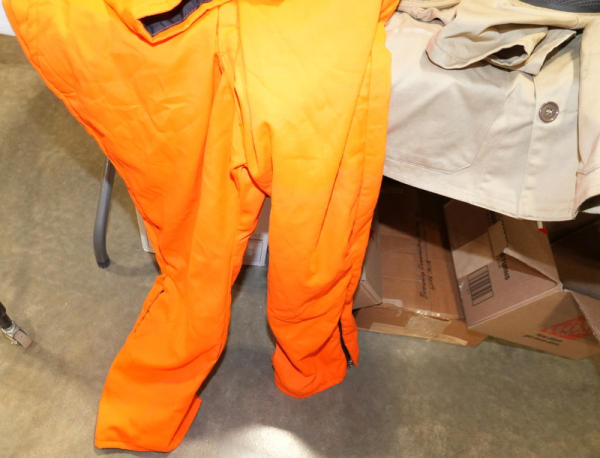 includes a pair of J.C. Higgins hunting pants; orange overalls are size XL; rest look like about size large; all used w/some minor wear; sell for one money