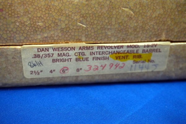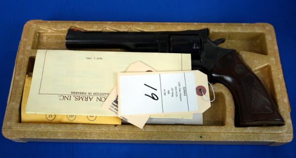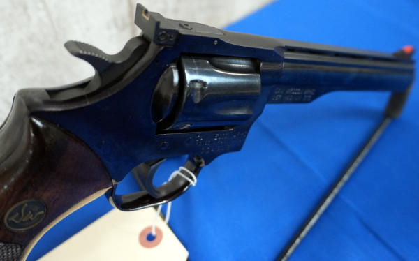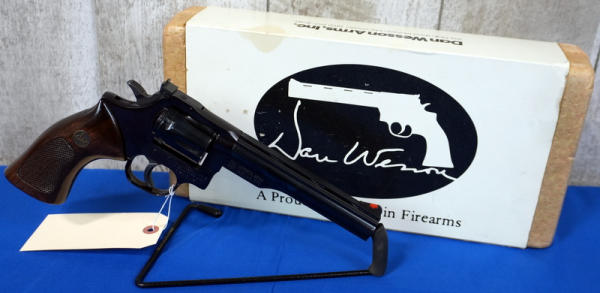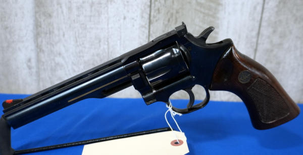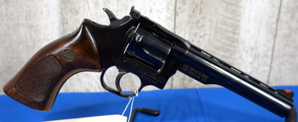6" VR-BBL; red ramp front sight w/rear white outline; factory wood checkered grips; 6-shot swing out cylinder; factory foam case w/cardboard sleeve; used but extremely clean & nice; USA; SN#324942; A-196