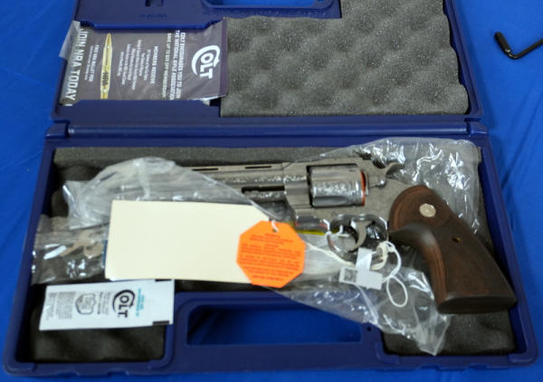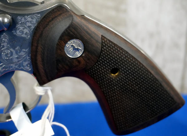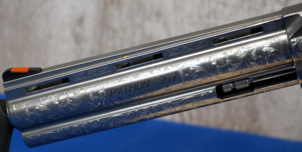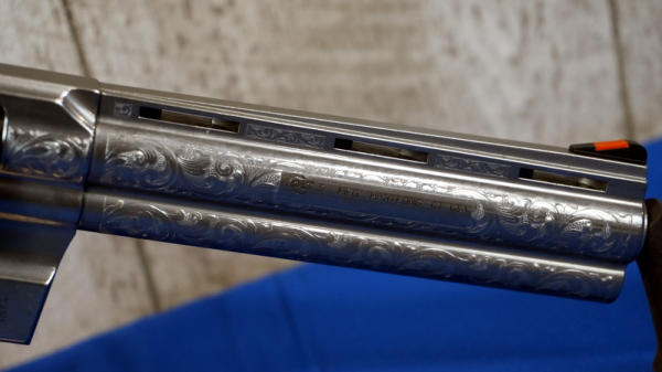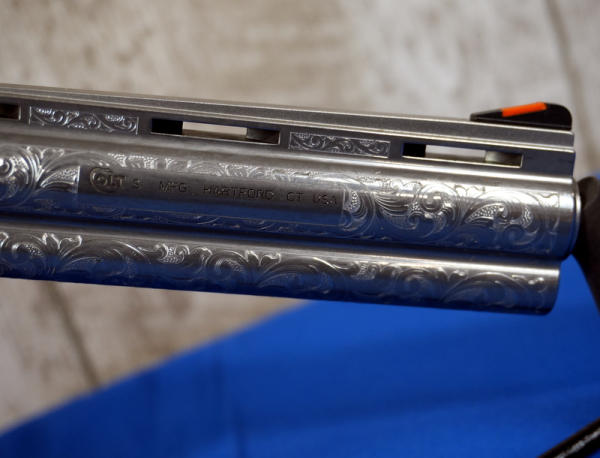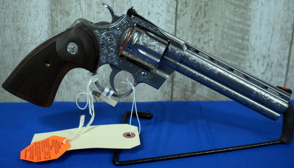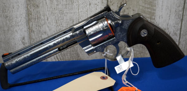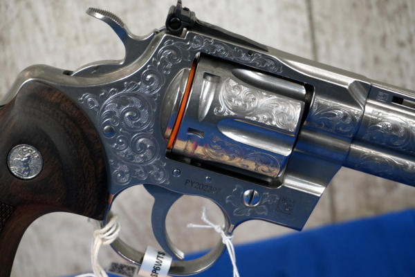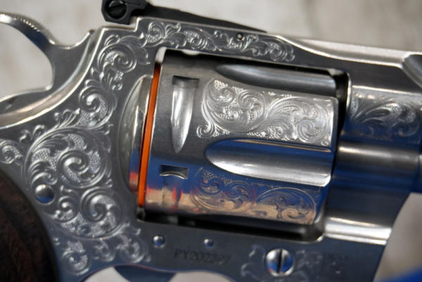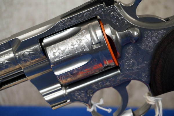 6" VR-Stainless Barrel; gun is engraved on all the metal!; red ramp front sight; 6-shot swing out cylinder; mint & unfired; wood checkered grips; factory hard case; Beautiful gun; USA; SN#PY202397; A-196