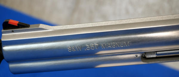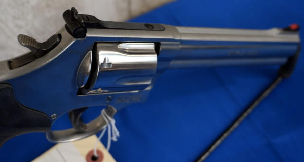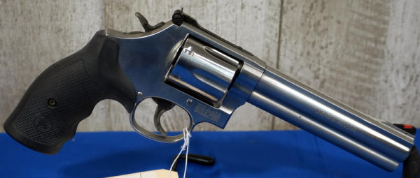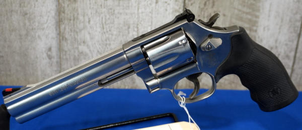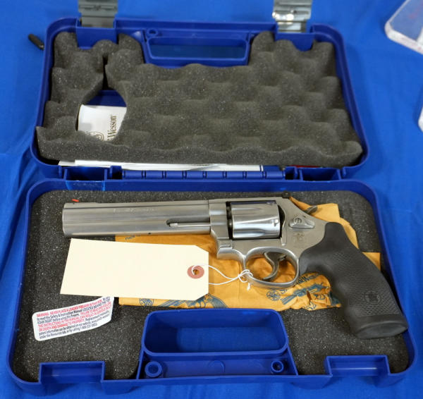 6" Stainless Barrel; rubber finger groove grips; red ramp front sight w/rear white outline; 6-shot swing out cylinder; factory hard case; used but very clean; USA; SN#CXU8153; A-183